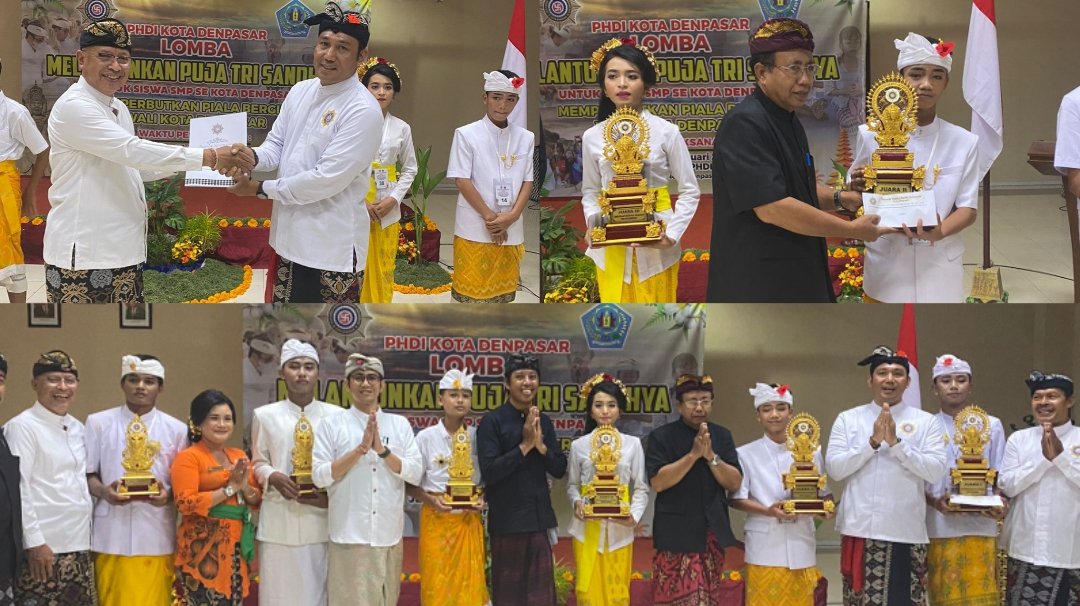 Penyerahan hadiah bagi pemenang Lomba Melantunkan Puja Tri Sandhya Tingkat SMP se-Kota Denpasar di Aula PHDI Provinsi Bali, Jumat (24/2/2023) sore. (Kolase: DKD/Dkmfs/WK)