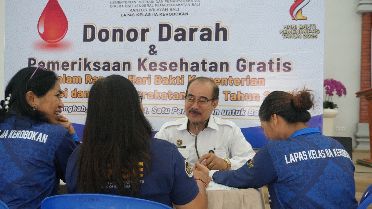 Barometer Bali | Denpasar – Dalam rangka menyambut Hari Bakti Kementerian Imigrasi dan Pemasyarakatan (Kemenimipas) yang ke-1, Lembaga Pemasyarakatan (Lapas) Kelas IIA Kerobokan menyelenggarakan kegiatan donor darah dan pemeriksaan Kesehatan gratis petugas Lapas, Kamis (13/11/2025).