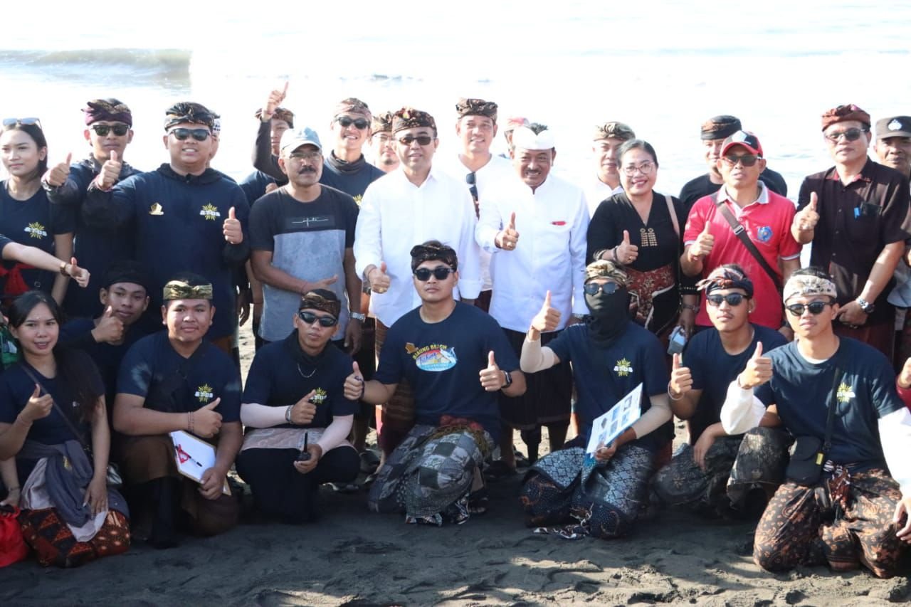 Foto: Walikota Denpasar, I Gusti Ngurah Jaya Negara didampingi Ketua DPRD Denpasar, I Gusti Ngurah Gede dan tamu undangan lainnya melepas tukik, dan melempar alat pancing pertama sebagai tanda dibukanya Biaung Beach Fishing Tournament I, Minggu (12/5/2024) di Pantai Biaung, Kesiman Kertalangu, Denpasar Timur. (Sumber:BB/Pur).
