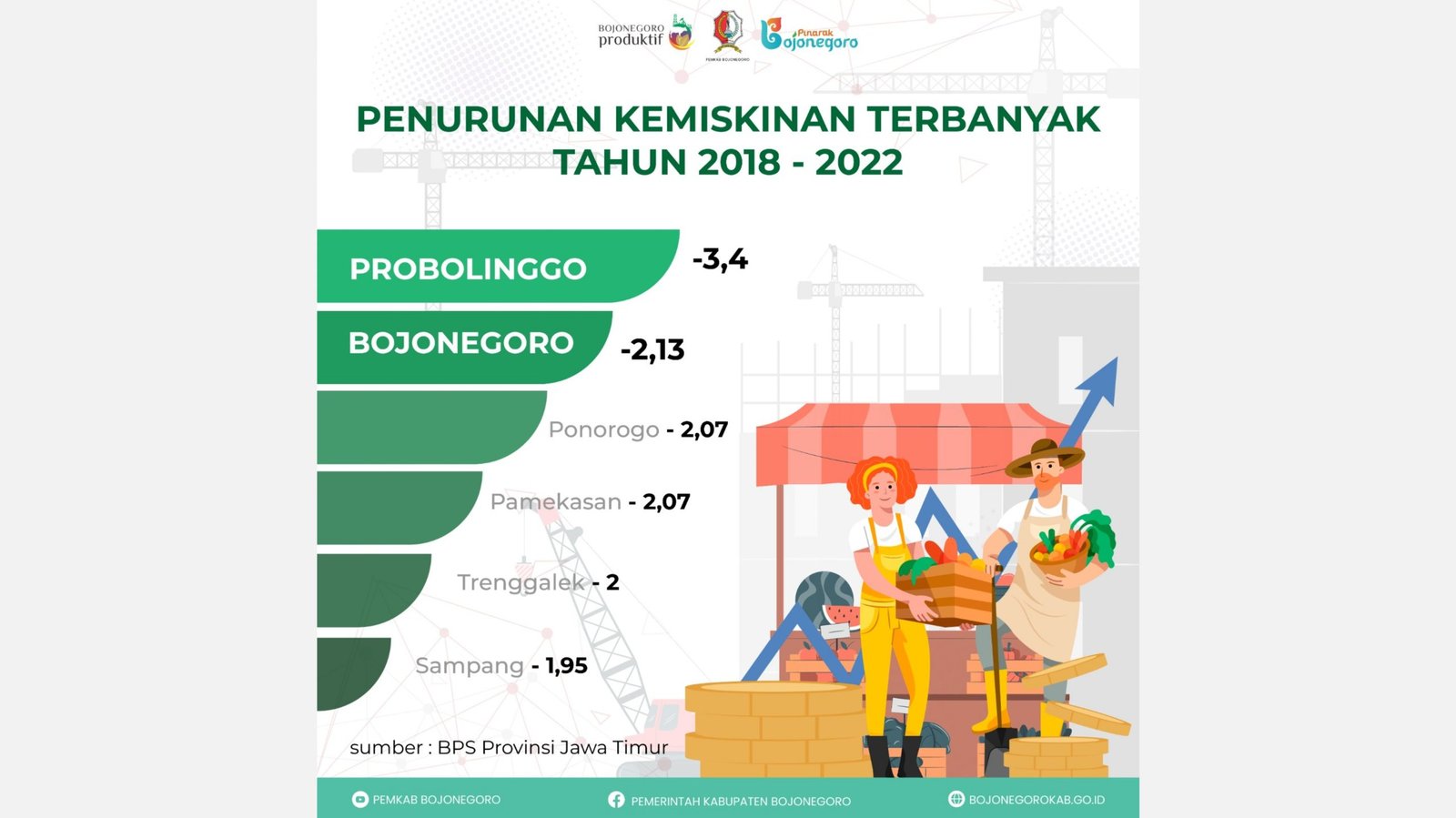 Sementara berdasarkan kontribusi terhadap penurunan angka kemiskinan di Provinsi Jawa Timur, Kabupaten Bojonegoro berada di urutan 7 terbesar. Yakni mampu berkontribusi dalam menurunkan angka kemiskinan di Provinsi Jawa Timur sebesar 6,91 persen atau setara 10.540 jiwa.