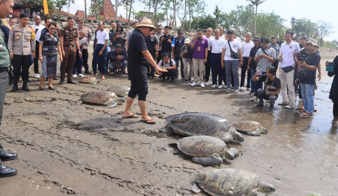 Foto: Bupati Jembrana Nengah Tamba melepasliarkan belasan penyu hijau hasil pengungkapan kasus penyelundupan penyu oleh Polres Jembrana, di Pantai Desa Perancak, Jembrana, Selasa (21/11/2023). (Sumber: Prokopim Jbr)