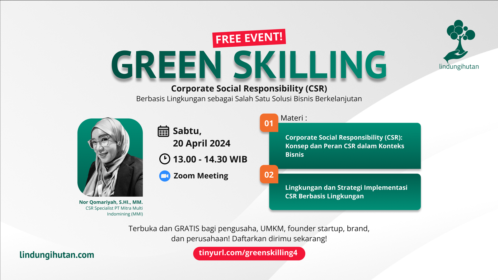 LindungiHutan hadirkan kembali webinar gratis Green Skilling dengan topik bahasan “Corporate Social Responsibility (CSR) Berbasis Lingkungan sebagai Salah Satu Solusi Bisnis Berkelanjutan” pada Sabtu, 20 April 2024.