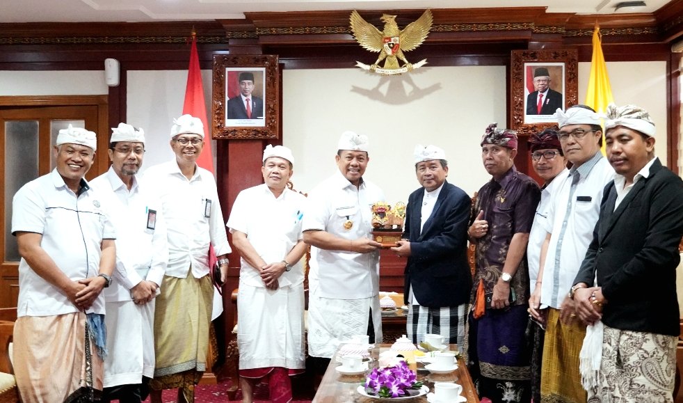 Foto: Pj Gubernur Bali SM Mahendra Jaya (lima dari kiri) menerima Ketua BKS LPD Provinsi Bali Nyoman Cendikiawan (lima dari kanan) dan rombongan saat audiensi di Kantor Gubernur Bali, di Denpasar pada Senin (27/11/2023). (Sumber: Hms Pemprov Bali)
