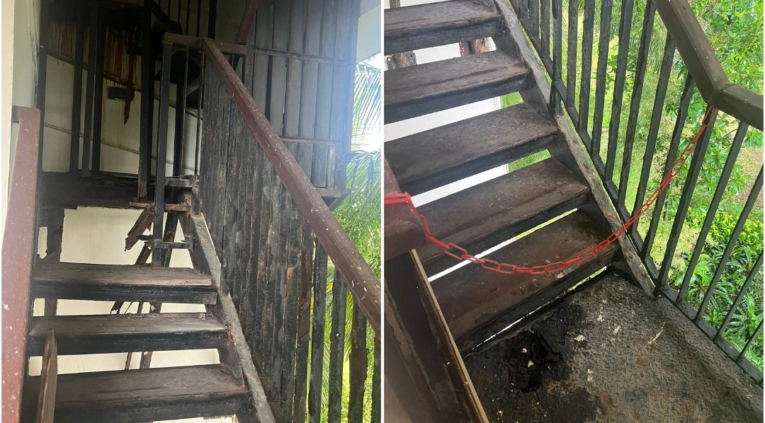 Kondisi tangga yang nampak sebagian rapuh menyebabkan korban Sebastian Chiti terjatuh dari lantai 5 (lima) sebuah hotel di Seminyak hingga terluka parah hingga dirawat di dua rumah sakit di Bali dan Malaysia tanpa memperoleh ganti rugi dari pihak hotel. (Kolase: BB/hp)