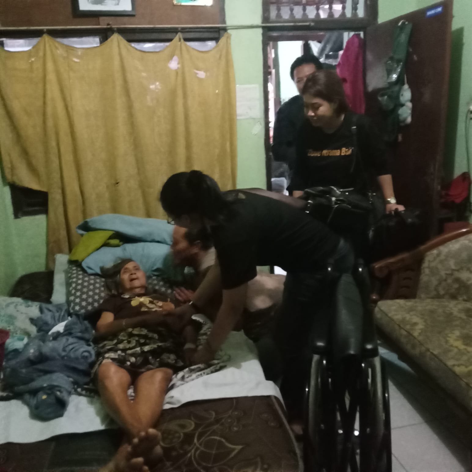 Foto: Ketua Yayasan Duwe Nyama Bali (DNB) Putu Panca Wardani (menunduk) menyerahkan bantuan kursi roda kepada I Gusti Niyang Kardi (80) yang terbaring lumpuh akibat serangan stroke di kediamannya Dusun/Banjar Sarimertha, Desa Negari, Kecamatan Banjarangkan, Klungkung, Rabu (27/9/2023). (Sumber: IGN Susila)