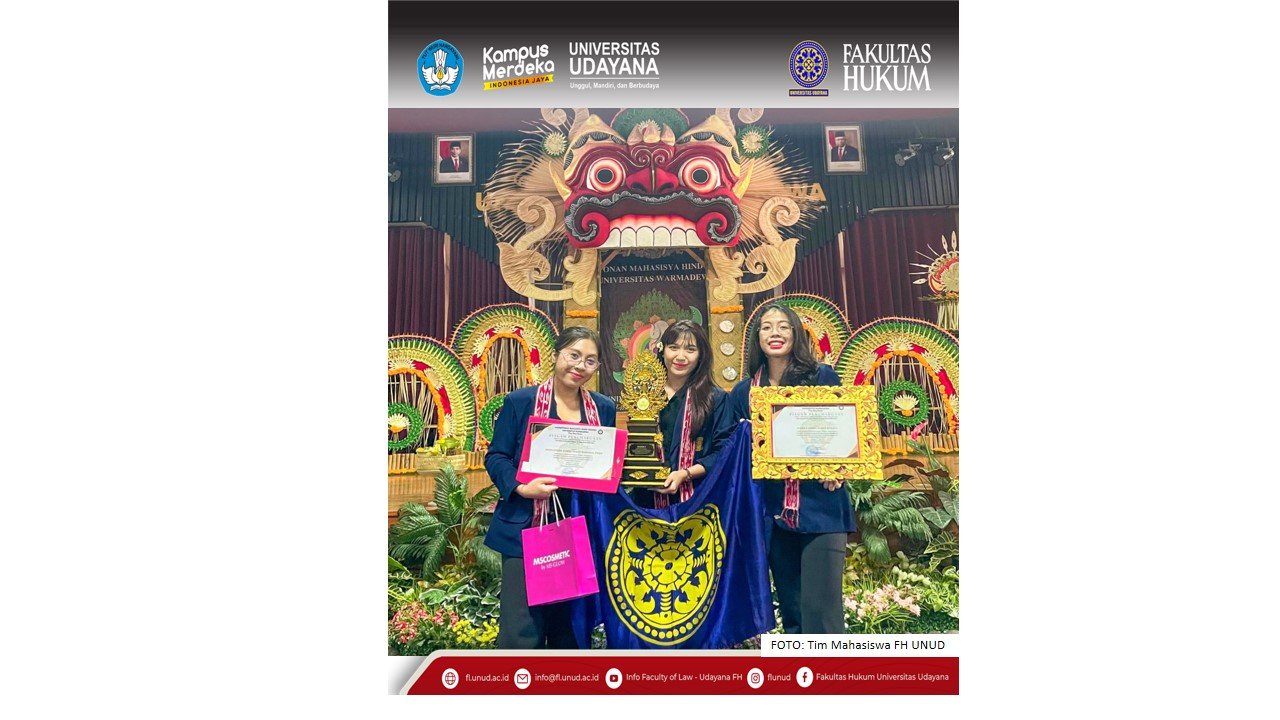 Denpasar | barometerbali – Tim mahasiswa FH UNUD yang terdiri dari 3 orang, yaitu: Cokorda Istri Kirana Pramesti selamu Ketua Tim, Kadek Ayu Maharani dan Kadek Sandra Putri Saniamarani, berhasil menyabet gelar juara lomba Debat Tingkat Nasional Tahun 2023 yang diselenggarakan oleh Unit Kegiatan Mahasiswa Pasemetonan Mahasiswa Hindu Dharma (PMHD) Universitas Warmadewa dengan didampingi oleh Dosen Pembina Edward Thomas Lamury Hadjon, S.H., LLM.