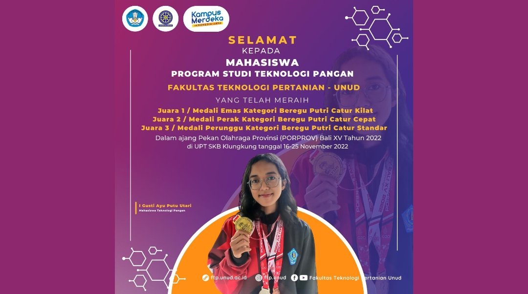 Kegiatan Porprov bidang catur ini telah dilaksanakan tanggal 16 – 25 November 2022 di UPT SKB Klungkung. Dengan berhasilnya meraih 3 medali, hal ini juga menambah prestasi yang diraih mahasiswa Fakultas Teknologi Pertanian dalam bidang Non Akademik pada Porprov Bali 2022. Sebelumnya beberapa medali telah diraih oleh mahasiswa FTP Unud dalam perhelatan Porprov Bali 2022 yaitu 1 Medali Emas dan 2 Perak dari Cabang Olahraga Renang, 1 Medalli Perak dari cabang Softball, Medali Perunggu melalui Cabang Olahraga Judo serta medali perak melalui cabang Karate.