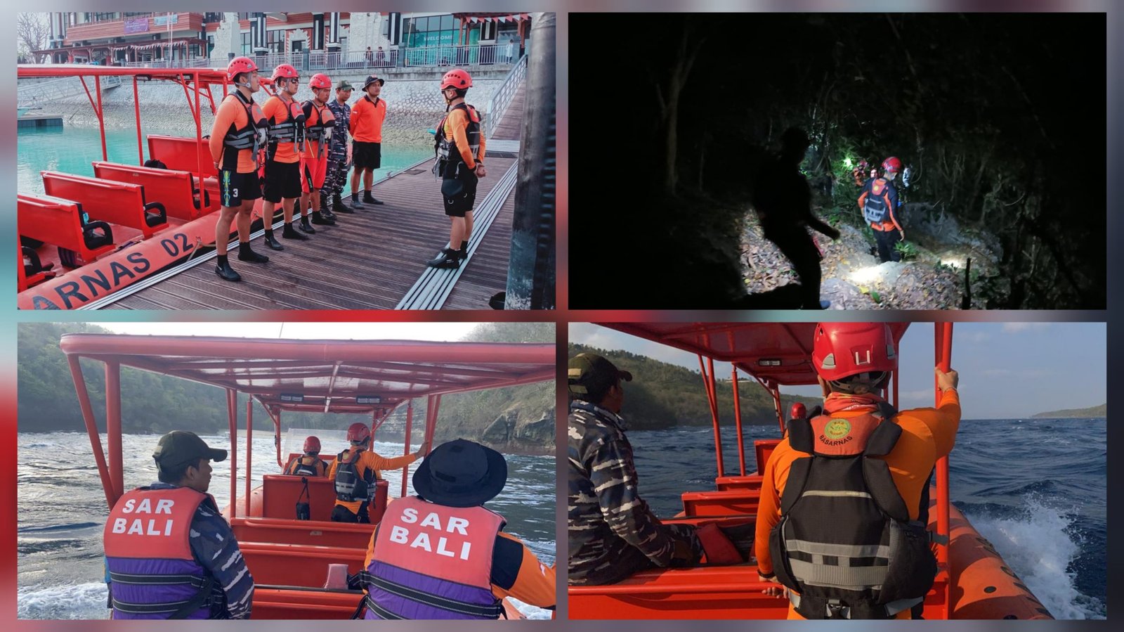 Kolase foto: Tim SAR gabungan mencari keberadaan pemancing I Wayan Sutrisna (30), warga Banjar Cabang, Desa Sakti, Nusa Penida, Klungkung yang dikabarkan hilang dihantam ombak di tebing perairan Tanjung Naup, Nusa Penida, Klungkung, Kamis (5/10/2023) malam. (Sumber: Ay/Hms Basarnas Bali)