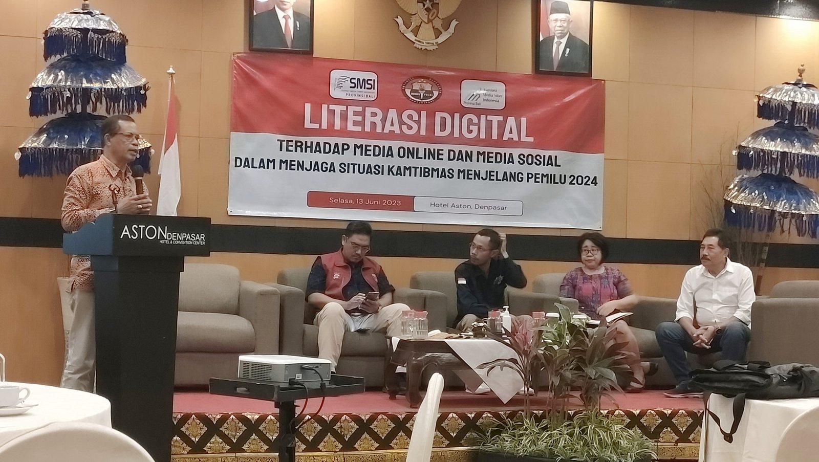 Foto: Ketua SMSI Bali Emanuel Dewata Oja (Edo) jelaskan pentingnya peran media siber (online) sebagai “rumah pembersih” di tengah disrupsi informasi di dunia maya diungkapkan di acara Literasi Digital terhadap Media Online dan Media Sosial dalam Menjaga Situasi Kamtibmas menjelang Pemilu 2024 di Hotel Aston, Denpasar, Selasa (13/6/23). (BB/Ngurah Dibia)