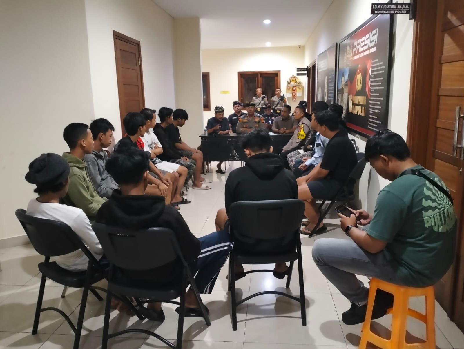 Foto: Kapolsek Kuta Selatan, Kompol I Gusti Ngurah Yudistira, memimpin mediasi antara dua kelompok pemuda yang berselisih di Markas Polsek Kuta Selatan pada Jumat (6/12). (barometerbali/213)