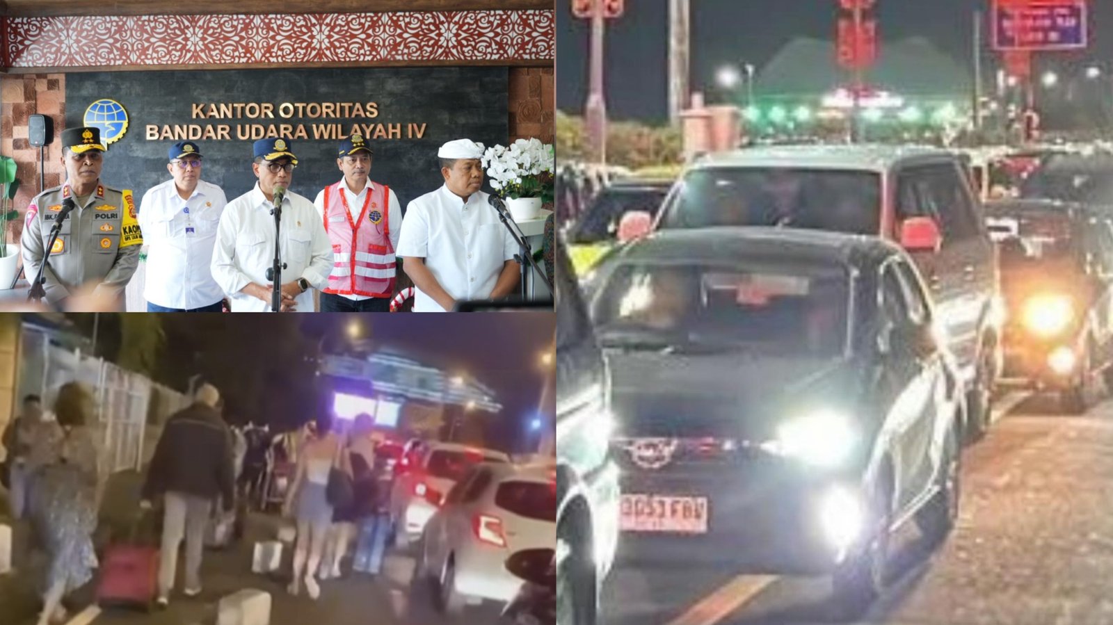 Kolase foto: Kondisi kemacetan parah di Jalan Tol Bali Mandara menyebabkan wisatawan berjalan kaki mengejar jadwal penerbangan pesawat menuju bandara Ngurah Rai, Menhub Budi Karya Sumadi (tengah) memberikan arahan mengatasi kemacetan di Bali didampingi Pj Gubernur Bali Sang Made Mahendra Jaya (kanan) dan Kapolda Bali Irjen Pol. Ida Bagus Kade Putra Narendra (kiri) saat gelar Rakor di Kantor Otoritas Bandar Udara (Bandara) Wilayah IV Bandara Internasional I Gusti Ngurah Rai, Tuban, Bai, Minggu (31/12/2023). (Sumber: BB/hmspoldabali/tangkapan layar ig@infodenpasar))