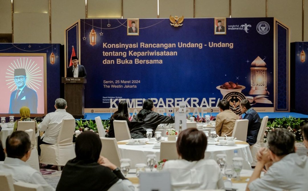 “Dari sisi kebijakan, anggaran dan keterlibatan harus kita tata dengan lebih baik. UU Nomor 10 tahun 2009 sudah hampir 15 tahun, harus sama-sama kita rancang untuk memberikan kontribusi yang lebih signifikan kedepan,” kata Menparekraf Sandiaga, dalam sambutannya pada “Konsinyasi RUU tentang Kepariwisataan dan Buka Bersama”, di The Westin Jakarta, Senin (25/3/2024).