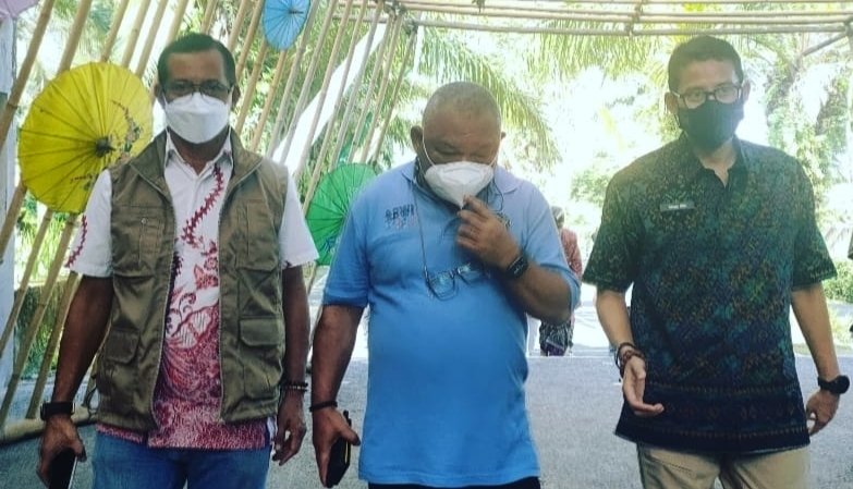 Ketua SMSI Bali Emanuel Dewata Oja (Edo) saat menemani Menparekraf RI Sandiaga Uno (kanan) dan Deputi Kemenparekraf Vinsensius Jemadu di Taman Nusa, Gianyar, Kamis (24/3/2022)