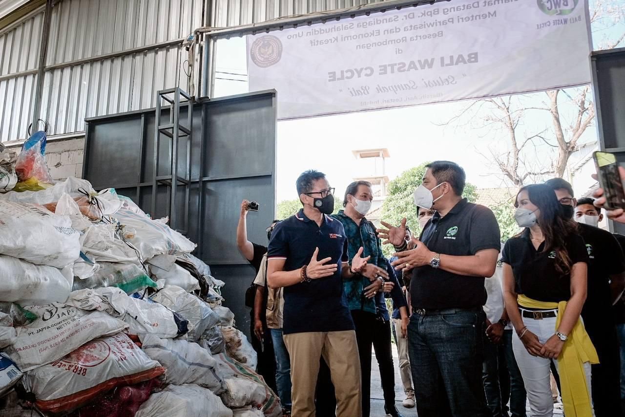 Foto: Menparekraf Sandiaga Uno (kiri) saat mengunjungi Bali Waste Centre (BWC) di sela-sela side event G20 pada tanggal 14 Mei 2022, disambut Founder BWC Putu Ivan Yunatana di Jl. Cargo Indah II, Ubung, Kecamatan Denpasar Utara, Kota Denpasar, Bali. (Sumber: BB/dok/kemenparekraf)