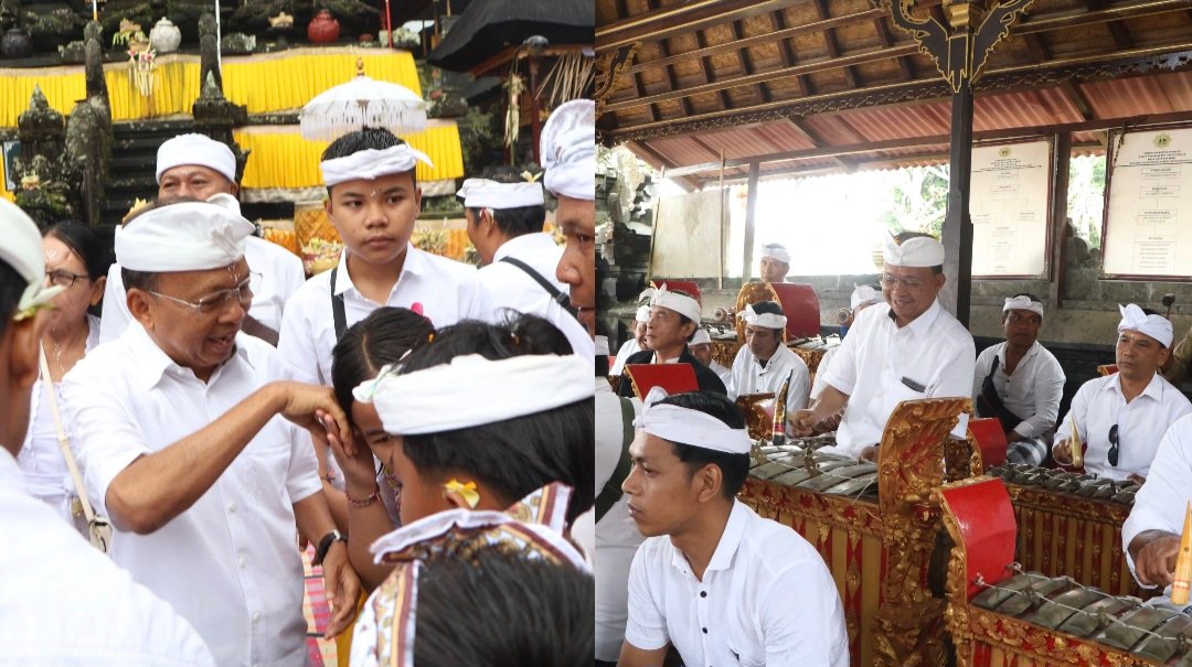 Bertempat di Pura Merajan Kanginan, Gubernur asal Desa Sembiran, Buleleng ini tidak hanya hadir untuk persembahyangan, tetapi juga secara aktif terlibat dalam megambel (menabuh gamelan) bersama para pemedek. Tarian sakral Topeng Sidakarya yang dipentaskan di Jaba Pura pun semakin hidup dengan alunan gamelan yang dipimpin langsung oleh orang nomor satu di Bali tersebut.