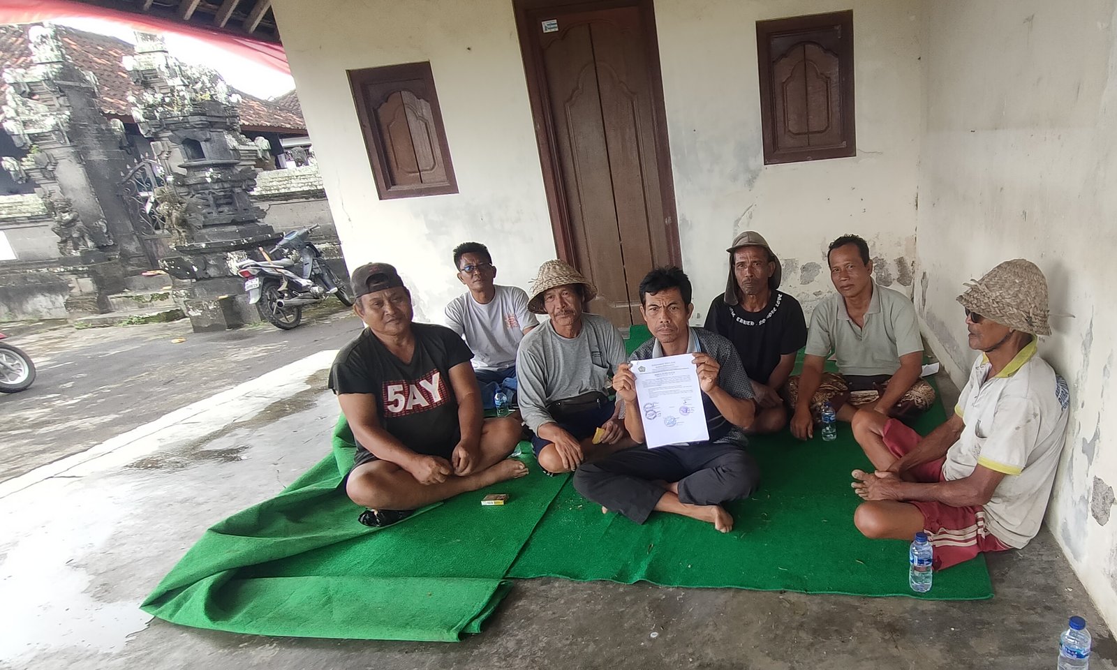 Foto: Pekaseh Wayan Sarimerta dan Krama Subak Pedahanan Yeh Lau, Desa Jagapati dan Desa Angantaka, Kecamatan Abiansemal, Kabupaten Badung tunjukkan keputusan perarem yang salah satu poinnya mencegah alih fungsi lahan sawah menjadi pemukiman oleh pihak luar/pengembang, di Pura Ulun Suwi/Subak setempat, Jumat (23/12/2022). (BB/db)