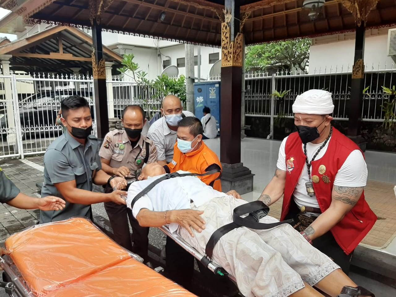 Jro Bima dibantu petugas PN Denpasar mengevakuasi Made Suka yang jatuh pingsan (BB/ist)