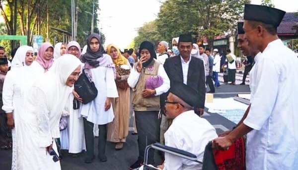 SHOLAT: Bupati Bojonegoro Anna Mu’awanah (kiri) menyapa warga dalam kegiatan Sholat Idul Fitri 1444H di Masjid Agung Darussalam Bojonegoro, Jawa Timur, Sabtu (22/4/2023). (Foto: BB/Redho)