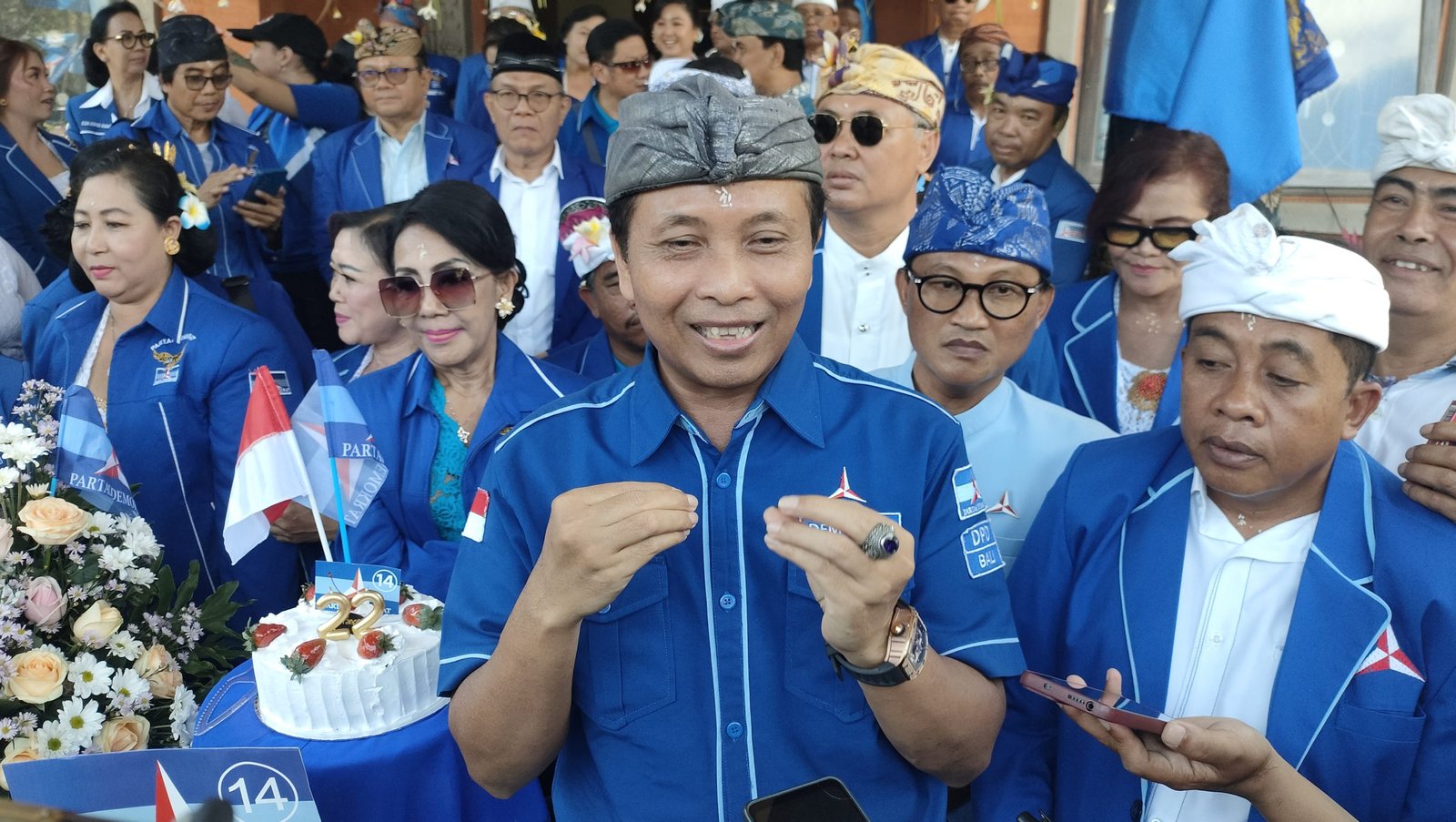 Foto: Ketua DPD Partai Demokrat Bali Made Mudarta (tengah) bersama keluarga besar DPD Partai Demokrat Bali peringati HUT ke-22 Partai Demokrat yang jatuh pada 9 September 2023 sekaligus juga HUT ke-74 Ketua Majelis Tinggi Partai Demokrat Susilo Bambang Yudoyono (SBY) di Kantor DPD Demokrat Bali, Renon Denpasar, Sabtu (9/9/2023). (Sumber: Ngurah Dibia)