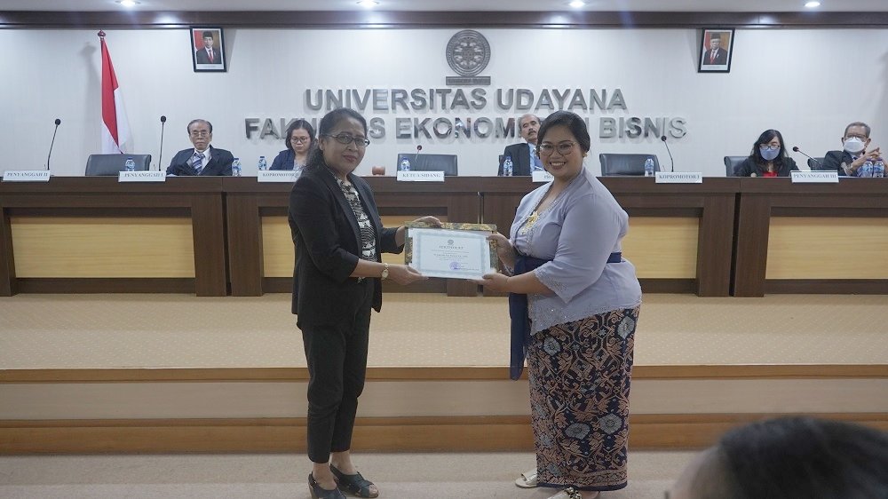 Promovenda Ni Luh Gde Ana Pertiwi, S.E., M.Si berhasil meraih gelar Doktor dalam Sidang Promosi Doktor Ilmu Ekonomi Fakultas Ekonomi dan Bisnis Universitas Udayana (FEB Unud), Denpasar, Kamis (19/1/2023). (Foto: FEB Unud)