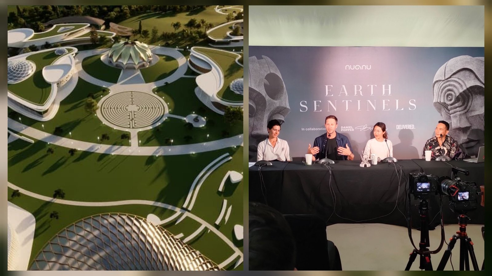 Kolase foto: Penampakan sebagian kawasan kota kreatif berkelanjutan Nuanu (kiri) dan suasana konferensi pers (kanan) dihadiri Tereze Strautmane (paling kiri), Daniel Popper (dua dari kiri) Adhelia Intan (dua dari kanan), dan Ichwan Hermecz (paling kanan) di Nuanu, Beraban, Kecamatan Kediri, Tabanan, Bali, Jumat (13/10/2023). (Sumber: Nuanu/Ngurah Dibia)