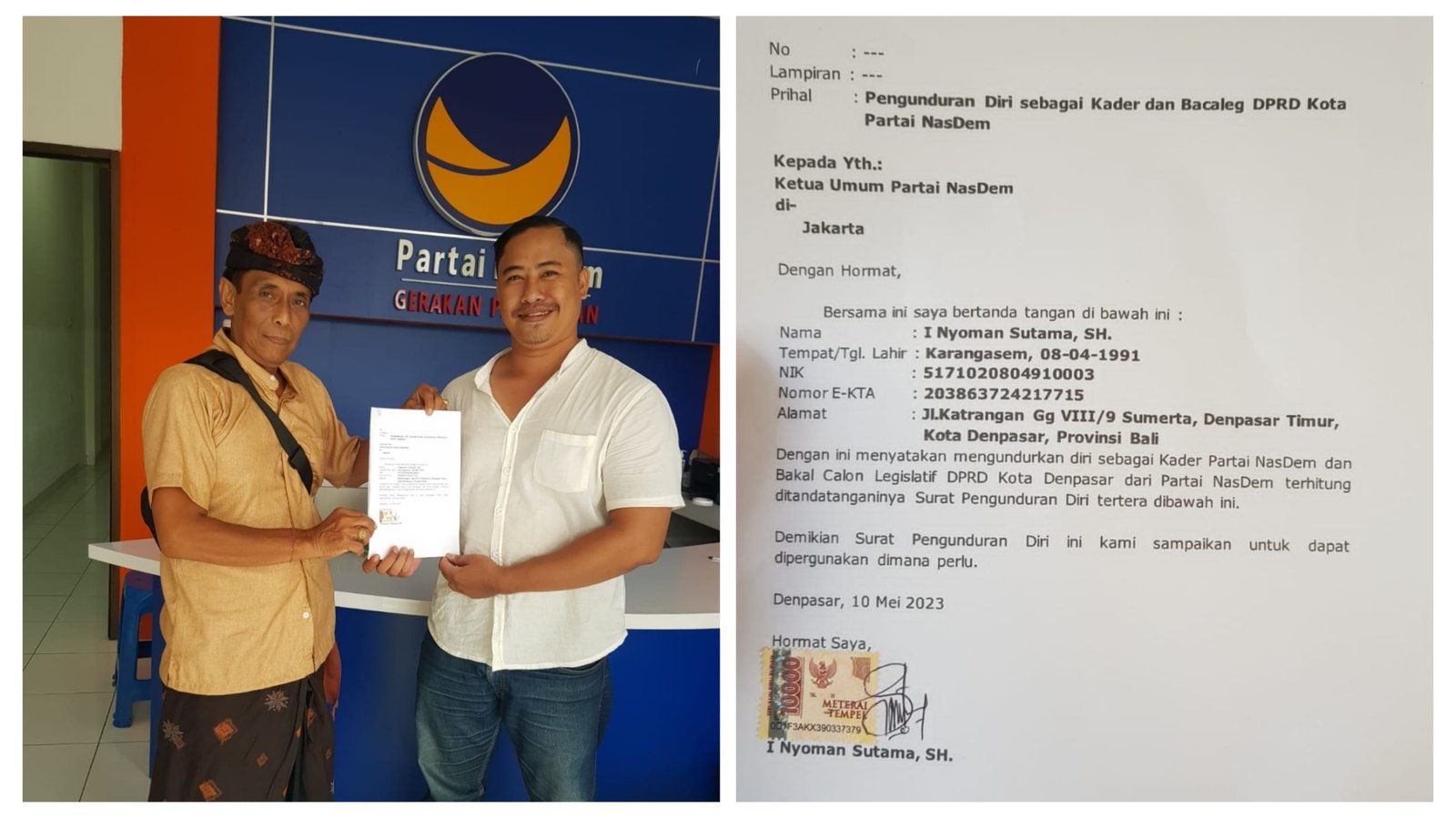 Foto: Ketua Garda Pemuda NasDem Kota Denpasar, I Nyoman Sutama, SH alias Mang Bangol, melayangkan surat pengunduran diri ke Kantor DPW NasDem Bali, Sabtu (13/5/23). (BB/Ngurah Dibia)