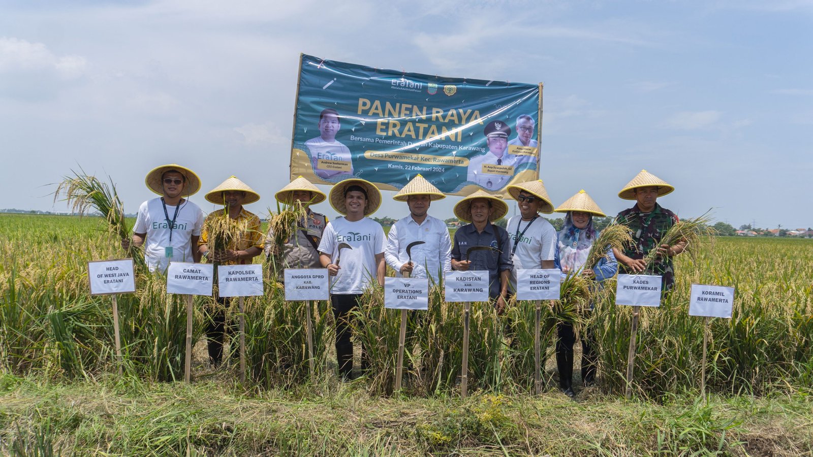 PT Eratani Teknologi Nusantara, perusahaan agritech yang memberikan pendampingan pertanian di Indonesia, menyelenggarakan kegiatan panen raya Petani Binaan Eratani di Kecamatan Rawamerta, Kabupaten Karawang, Jawa Barat, pada hari Kamis, 22 Februari 2024. Acara tersebut dihadiri oleh berbagai tokoh penting, termasuk Kepala Dinas Pertanian Kabupaten Karawang, Camat Kecamatan Rawamerta, Kapolsek, dan Koramil Kecamatan Rawamerta, serta Kepala Desa Purwamekar.