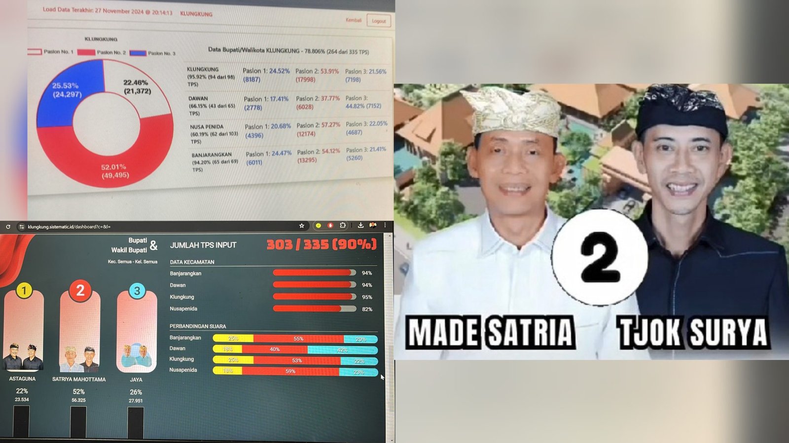 Kolase foto: Dari beberapa hasil rekapitulasi suara hitung cepat (quick count) sementara internal PDI Perjuangan menunjukkan paslon Made Satria-Tjok Surya (Satriya) nomor urut 2 unggul dalam Pilkada Klungkung 2024. (barometerbali/213)