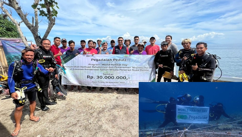 Pegadaian Kanwil VII Denpasar diwakili oleh Kepala Bagian CSR I Gusti Putu Susila, Kepala Bagian Pemasaran Ni Komang Nivianti, dan para staf bersama Kelompok Pecinta Karang Nuansa Pulau menanam terumbu karang untuk merehabilitasi laut di kawasan Nusa Penida, Sabtu, (26/11/2022).