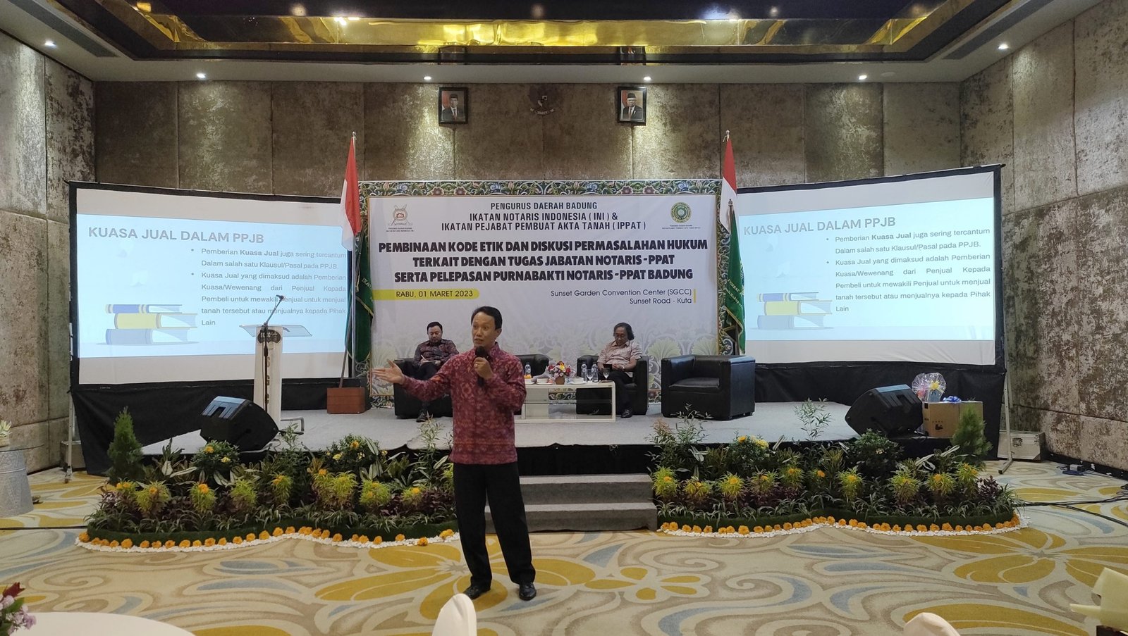Dr Made Pria Dharsana, SH, MHum saat memaparkan materinya dalam acara talkshow bertajuk, “Pembinaan Kode Etik dan Diskusi Permasalahan Hukum terkait dengan Tugas dan Jabatan Notaris-PPAT”, digelar Ikatan Notaris Indonesia (INI) dan Ikatan Pejabat Pembuat Akta Tanah (IPPAT) Pengurus Daerah Badung di Sunset Garden Convention Center (SGCC), Hotel Harris Jl. Sunset Road, Kuta, Rabu (1/3/2023). (BB/Db)