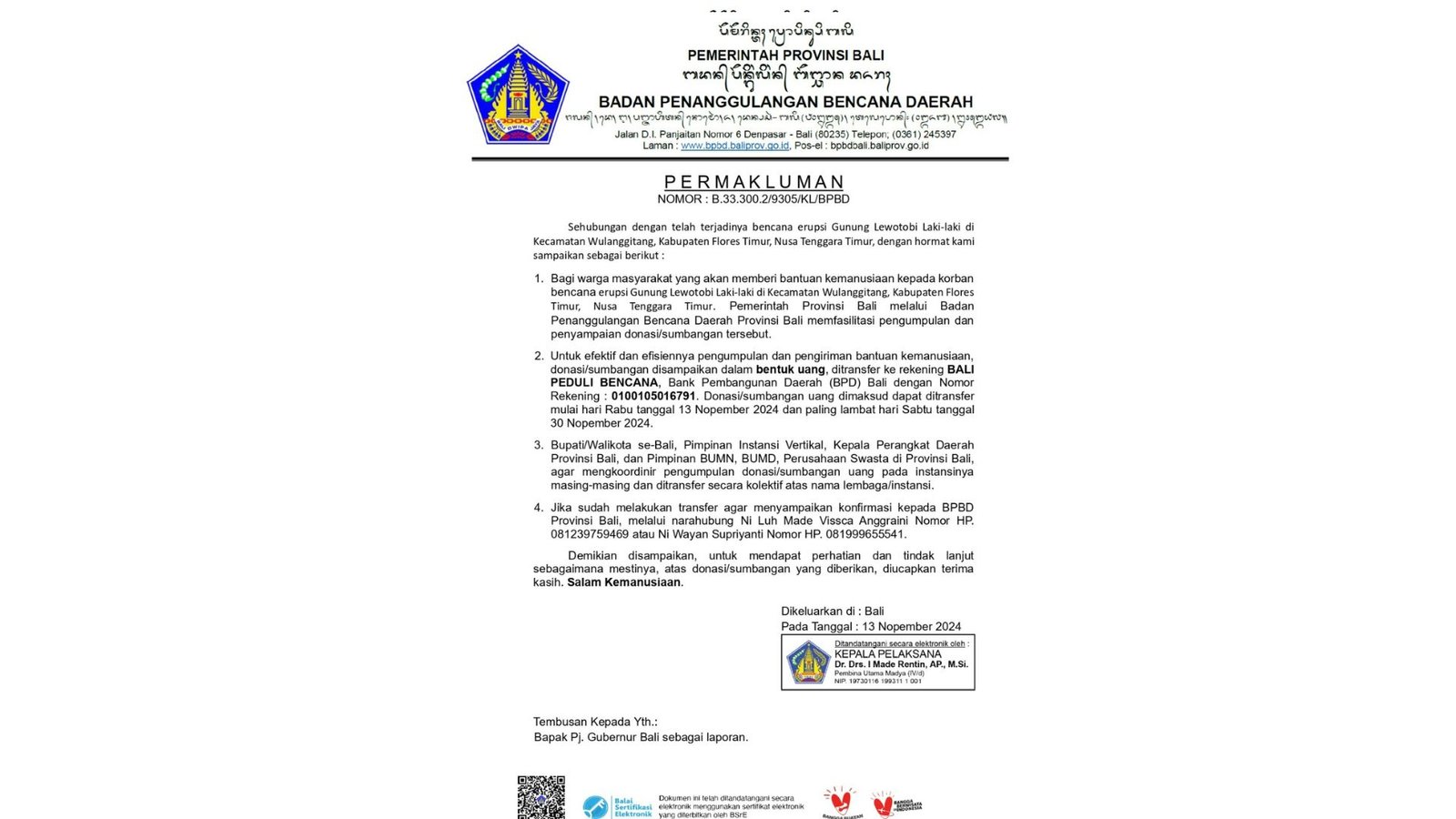 Masyarakat dapat menyalurkan donasi mulai 13 November hingga 30 November 2024 melalui rekening Bali Peduli Bencana di Bank Pembangunan Daerah (BPD) Bali dengan nomor rekening 0100105016791. Alternatif pembayaran melalui QRIS juga disediakan.