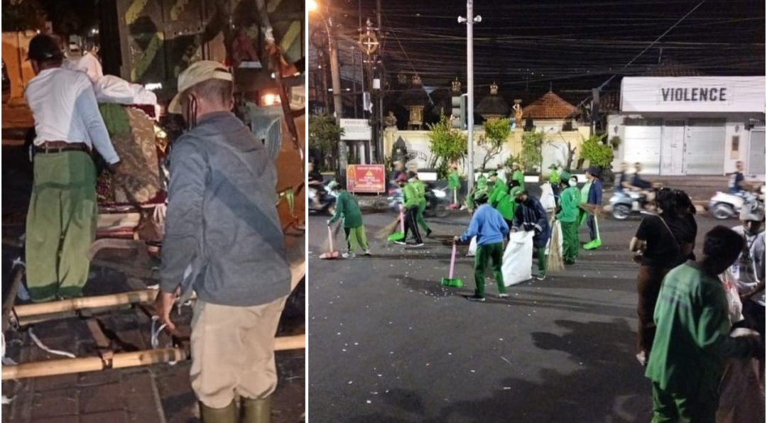 Tanggulangi sampah sisa Pangerupukan usai parade ogoh-ogoh, Pemkot Denpasar mengerahkan seluruh armada dan petugas kebersihan pada Selasa (21/3) malam, hingga subuh Rabu 22 Maret pukul 05.00 Wita. (Kolase: BB/Hms Pemkot Dps/DR)