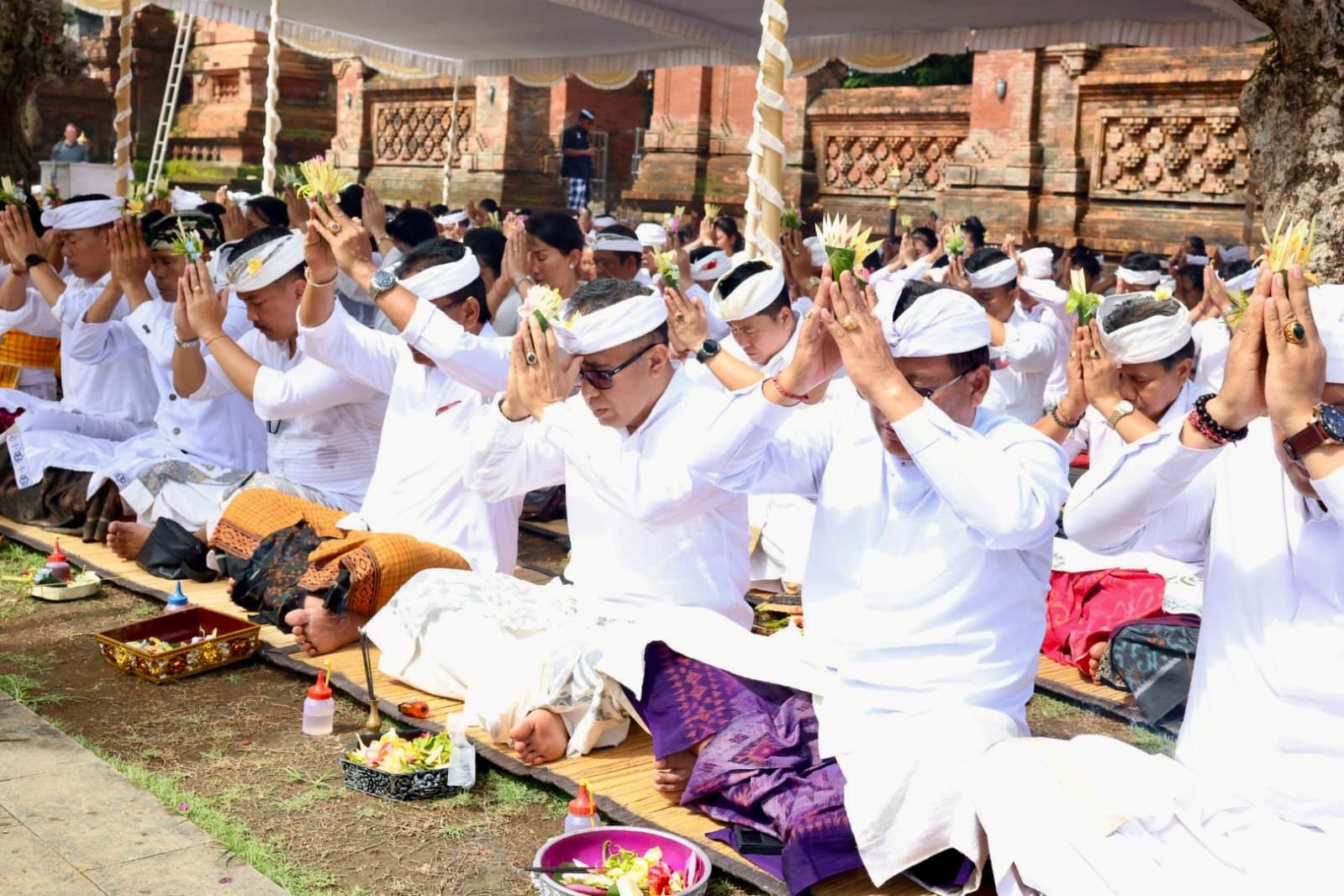 Suasana khidmat terasa saat kidung suci pemujaan Ida Sang Hyang Widhi Wasa dalam manifestasinya sebagai Dewi Saraswati dilantunkan. Para penabuh tampak mengiringi prosesi yang juga dipersembahkan tari Rejang Dewa oleh para siswa sekolah. Para pemangku Pura Agung Jagatnatha tampak khusyuk mempersiapkan upacara hingga persembahyangan selesai.