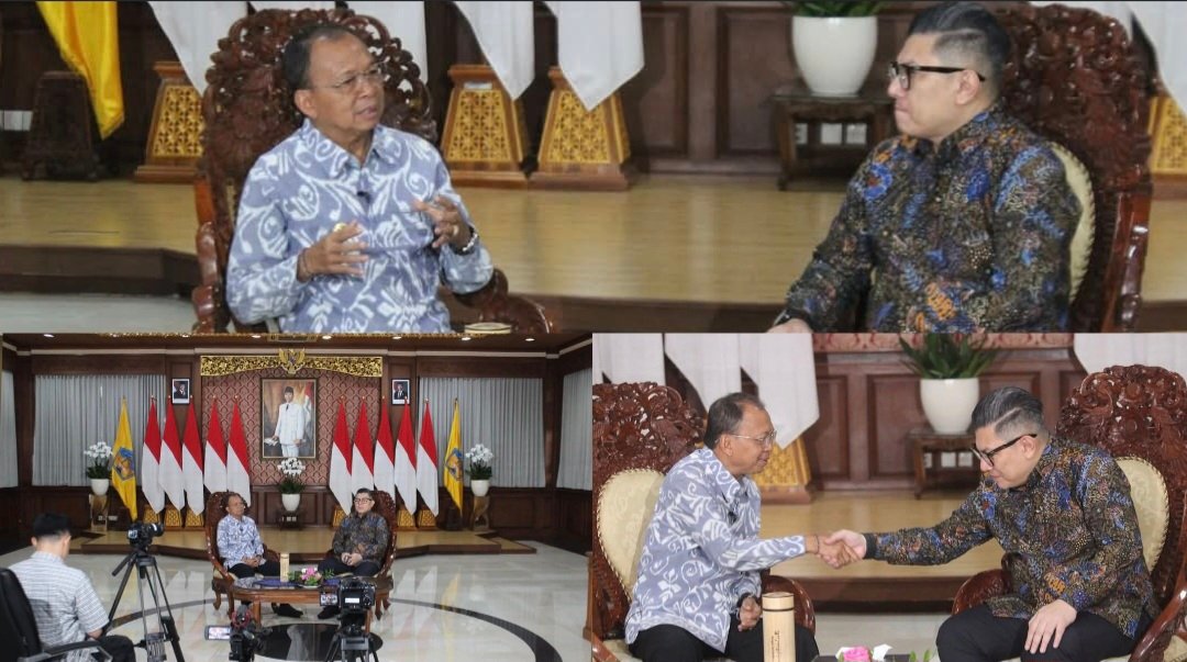 Kolase foto: Pemred Detik.com Alfito Deannova (kanan) mewawancarai khusus Gubernur Bali Wayan Koster terkait visi misi Nangun Sat Kerthi Loka Bali di Gedung Gajah, Jayasabha, Denpasar, Senin (10/3/2025). (barometerbali/peb/rah)