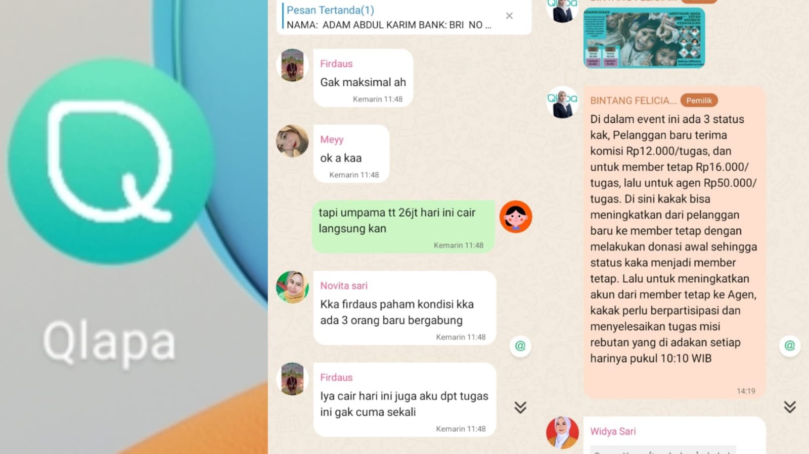 Berawal dari wanita Surabaya berinisial W tergabung dalam grup whatsapp event ramadhan yang mana di dalam grup tersebut terdapat admin yang mengaku nama Alisa (089678225113) memberikan tugas yang bisa menghasilkan komisi.