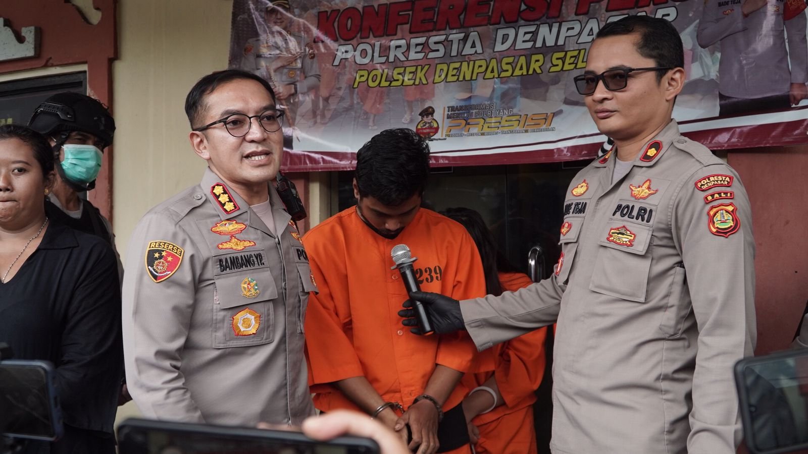 Kapolresta Denpasar Kombes Bambang Yugo Pamungkas (kiri) didampingi Kapolsek Denpasar Selatan Kompol I Made Teja Pramana (kanan) mewawancarai salah satu pelaku di Mapolsek Densel, Selasa (14/2/2023). (Foto: Polsek Densel/Polresta Dps/Skd)