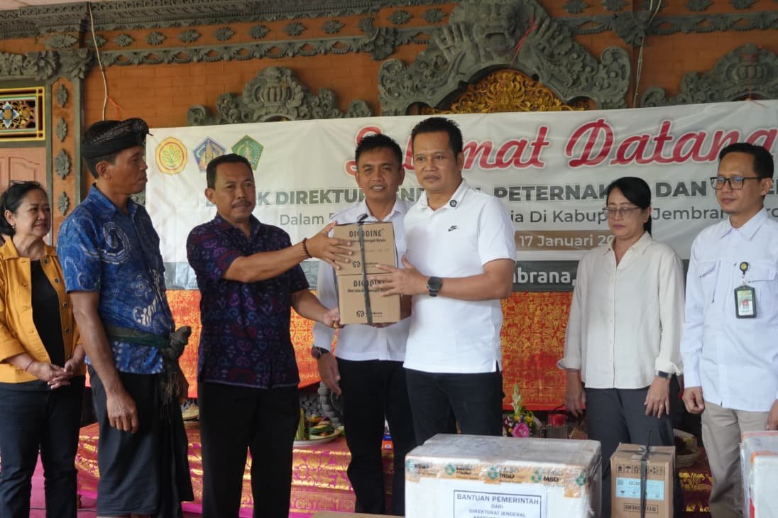 Bantuan diserahkan oleh Direktur Kesehatan Hewan, Direktorat Jenderal Peternakan dan Kesehatan Hewan Kementrian Pertanian, drh. Hendra Wibawa, M.Si., Ph.D., kepada Bupati Jembrana, I Made Kembang Hartawan, yang didampingi Wakil Bupati I Gede Ngurah Patriana Krisna (Ipat), di Balai Tempek III, Br. Tunas Mekar, Ds. Manistutu, Melaya.