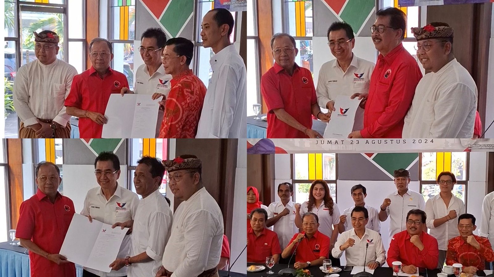 Kolase foto: Ketua Partai Perindo DPW Bali Komang Purnama menyerahkan surat rekomendasi dukungan partainya kepada petahana Wayan Koster untuk Pilgub Bali dan 3 paslon Pilkada Gianyar, Klungkung dan Karangasem di Inna Bali Heritage Hotel, Denpasar, Jumat (23/8/2024). (barometerbali/213)