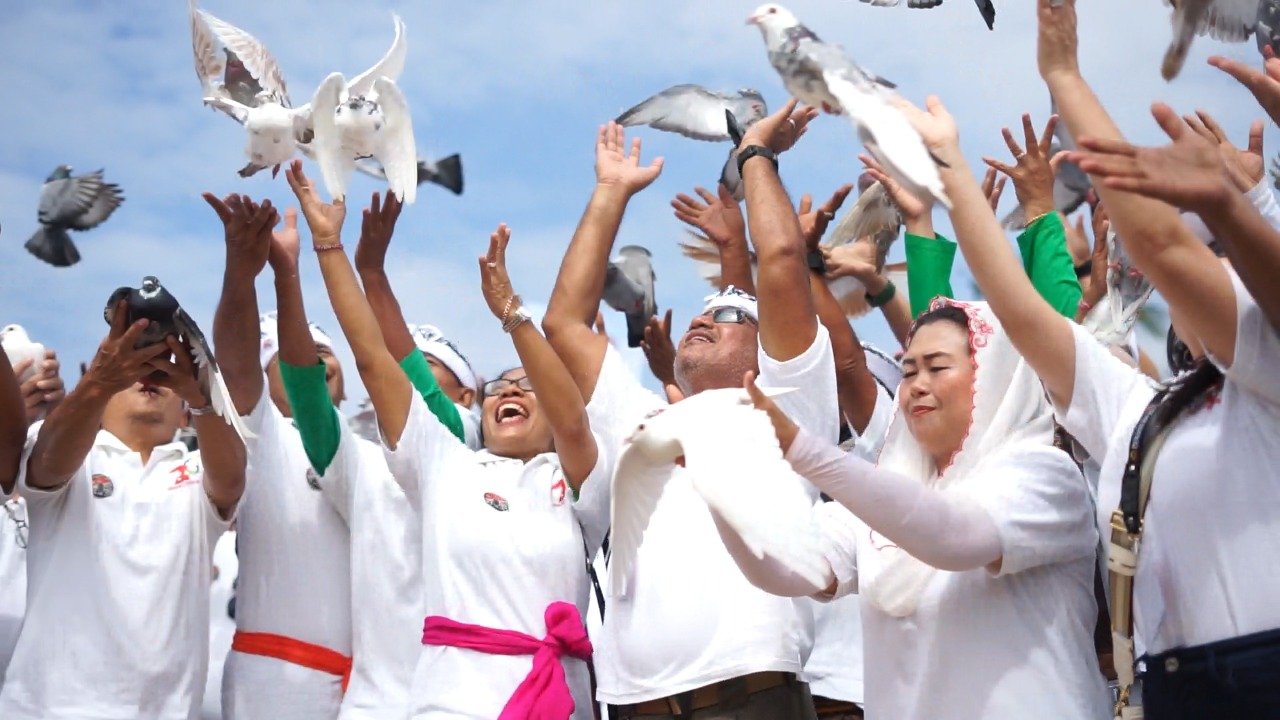 Ket foto: Pelepasan 100 ekor burung merpati, 60 ekor tukik, dan 6 ekor penyu warnai peringatan “20 Tahun Bom Bali”, di Pantai Marusaka, Nusa Dua, Rabu (12/10/2022). (ist)