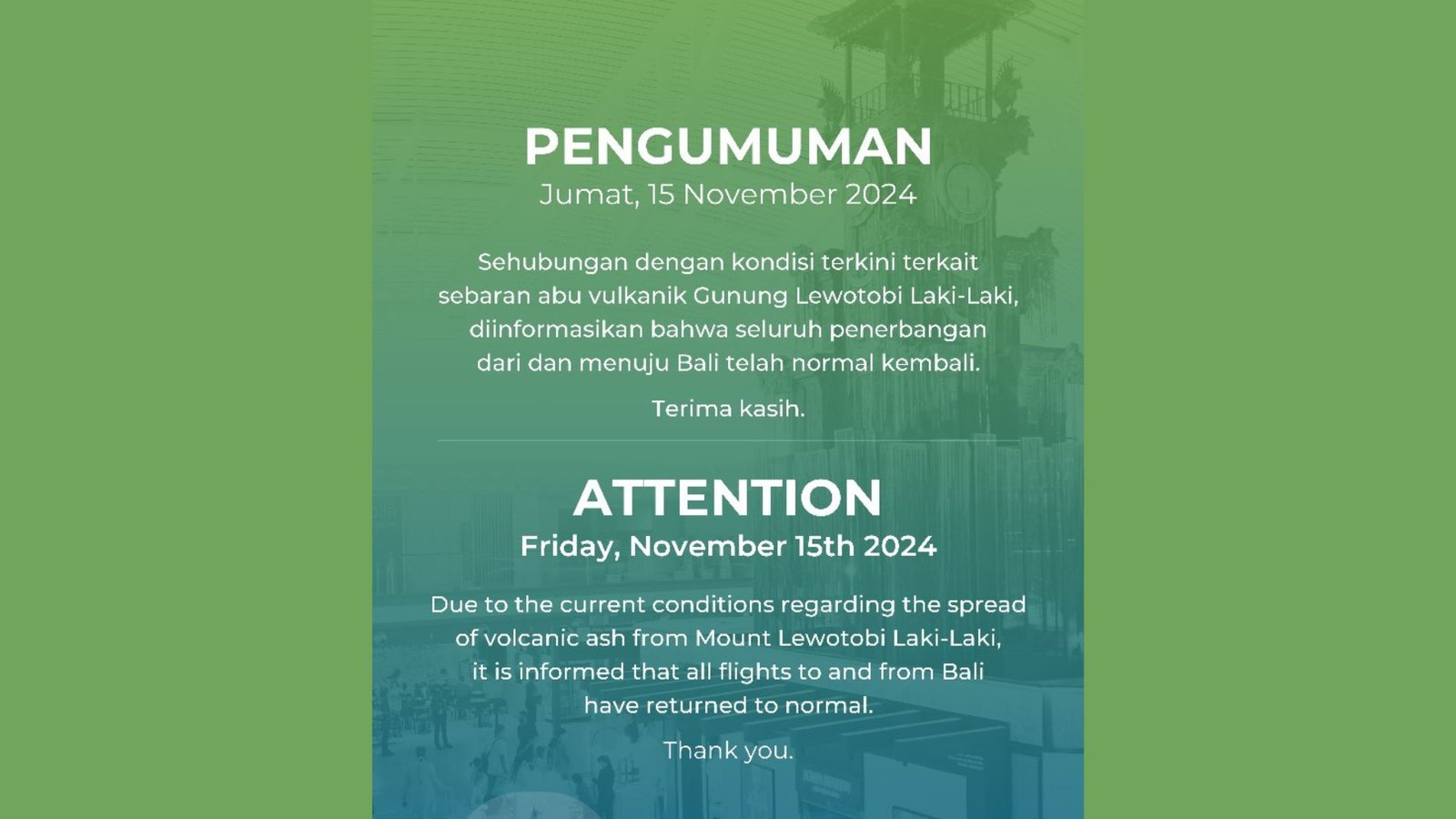 Berdasarkan Citra Satelit Cuaca Himawari, sejak Rabu malam sebaran abu vulkanik mengarah ke Barat Daya – Barat Laut menjauhi posisi Bandara Internasional I Gusti Ngurah Rai, sehingga kami berharap penumpang penerbangan yang terdampak dapat segera melanjutkan perjalanan kembali pada Kamis (14/11). Layanan helpdesk tetap difasilitasi di dua lokasi yakni lantai 2 terminal internasional dan area Customer Service maskapai untuk terminal domestik.