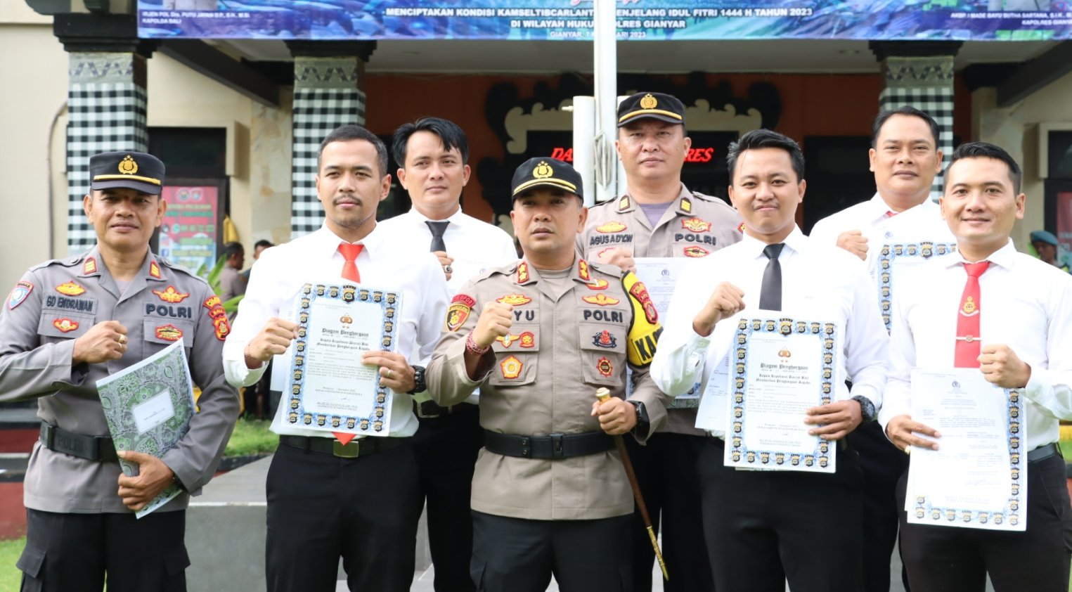 “Dari 9 personel yang menerima reward, 6 personel menerima reward atas dedikasi, loyalitas dan keberhasilannya dalam penyelesaian kasus sengketa tanah di Pangkung Batan Sukun Banjar Tegalulung Desa Adat Bonbiu Desa Saba Kecamatan Blahbatuh Gianyar,” ungkap Kapolres Bayu.