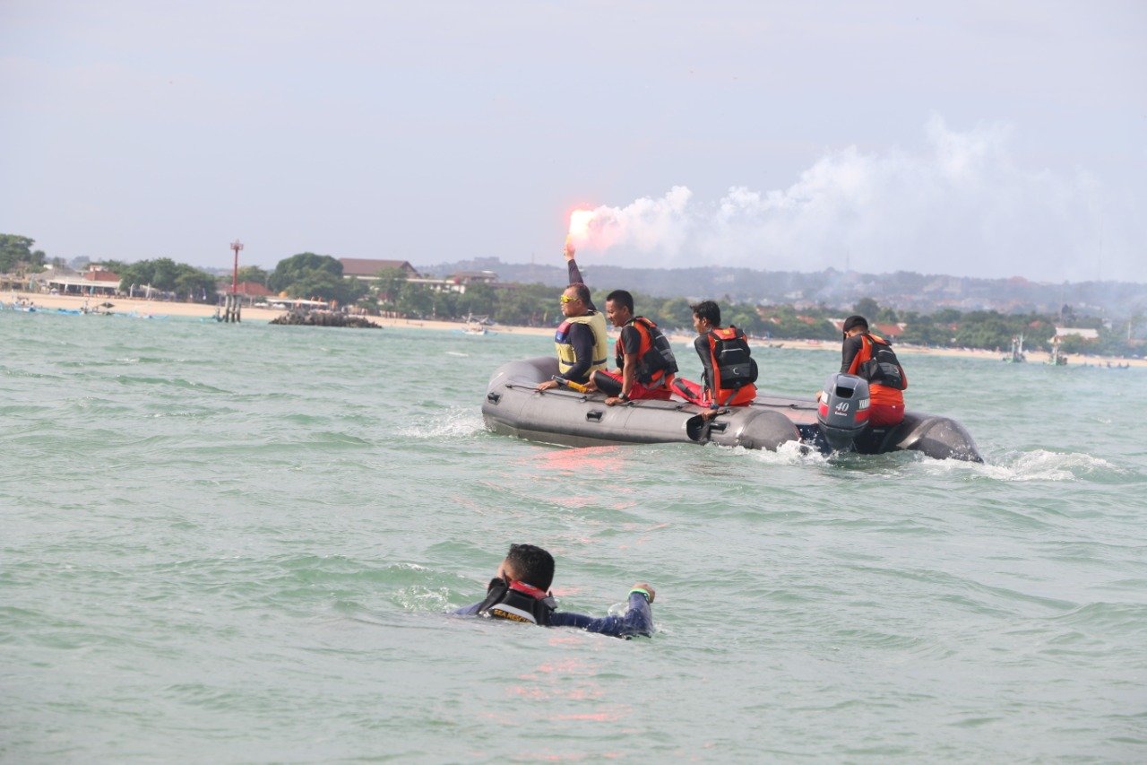 Demikian tergambar dalam adegan puncak kegiatan pelatihan Water Rescue dilakukan di Pantai Kelan, Desa Tuban, Kecamatan Kuta, Badung, Bali, Sabtu (25/6/2022).