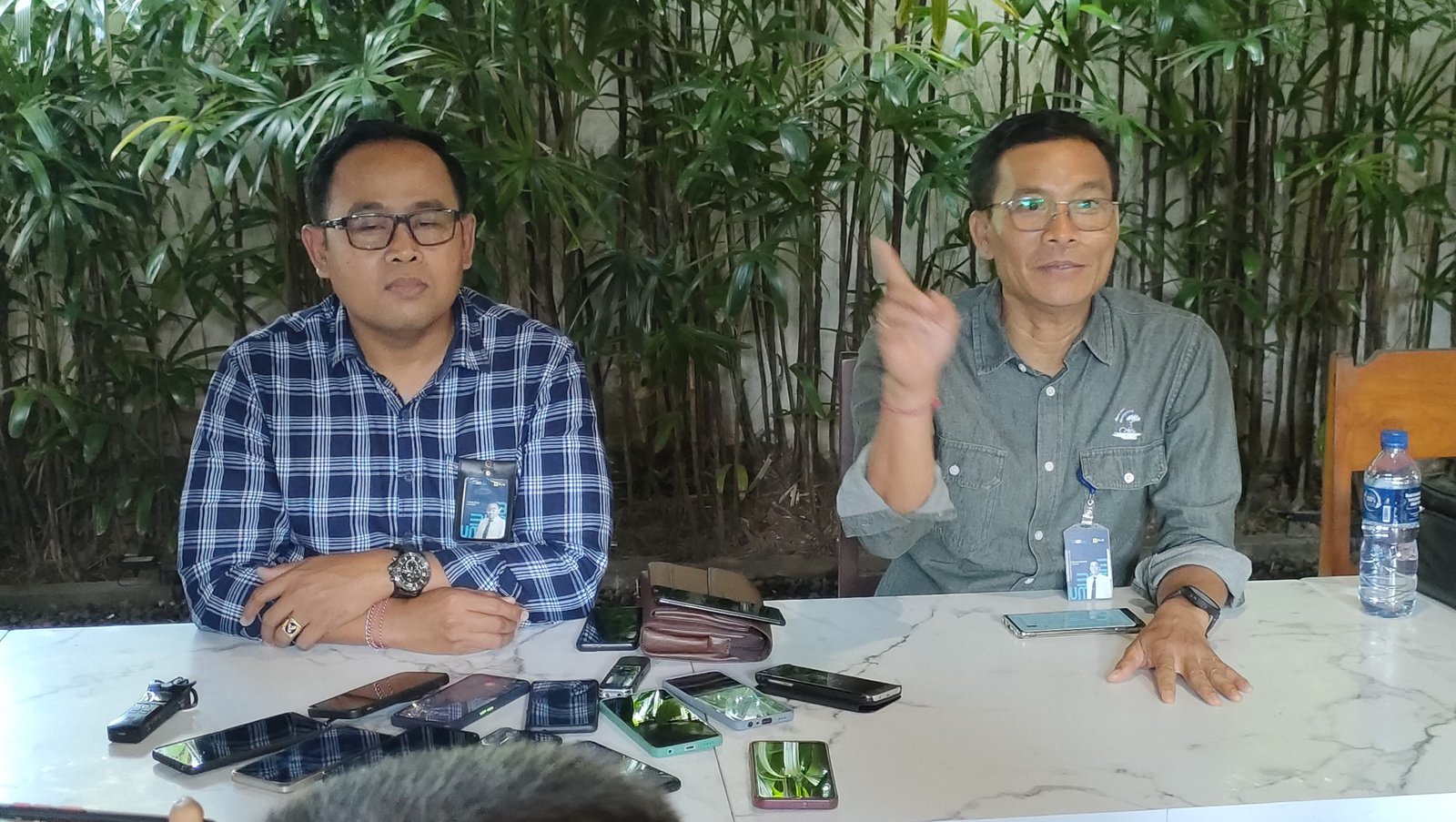 Foto: Manajer Efisiensi Pengukuran dan Mutu Sistem Distribusi di PLN UID Bali I Nyoman Jendra (kanan) didampingi I Manajer Komunikasi PLN UID Bali I Made Arya (kiri) saat konferensi pers di Denpasar, Rabu (31/5/2023). (BB/Ngurah Dibia)
