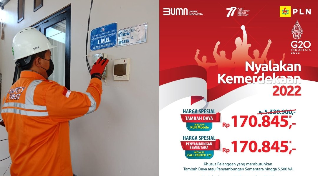 DISKON – Melalui promo “Nyalakan Kemerdekaan”, pelanggan PLN akan mendapatkan diskon besar untuk penambahan daya yakni dari harga Rp5.330.900 menjadi hanya Rp170.845.
