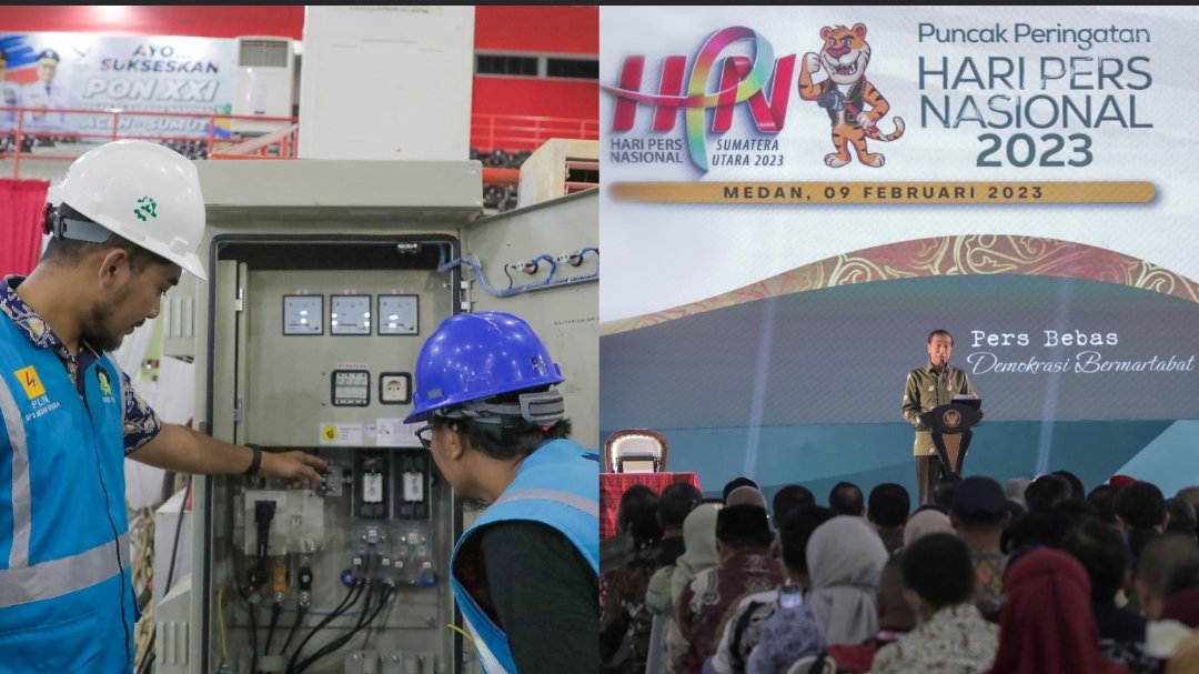 Perayaan puncak Hari Pers Nasional (HPN) 2023, yang dihadiri Presiden RI (kanan) berlangsung sukses berkat keandalan listrik PLN berlangsung di Gedung Serbaguna Pemerintah Provinsi Sumatera Utara, Kabupaten Deli Serdang, Kamis (9/2/2023). (Kolase: PLN/Ala)