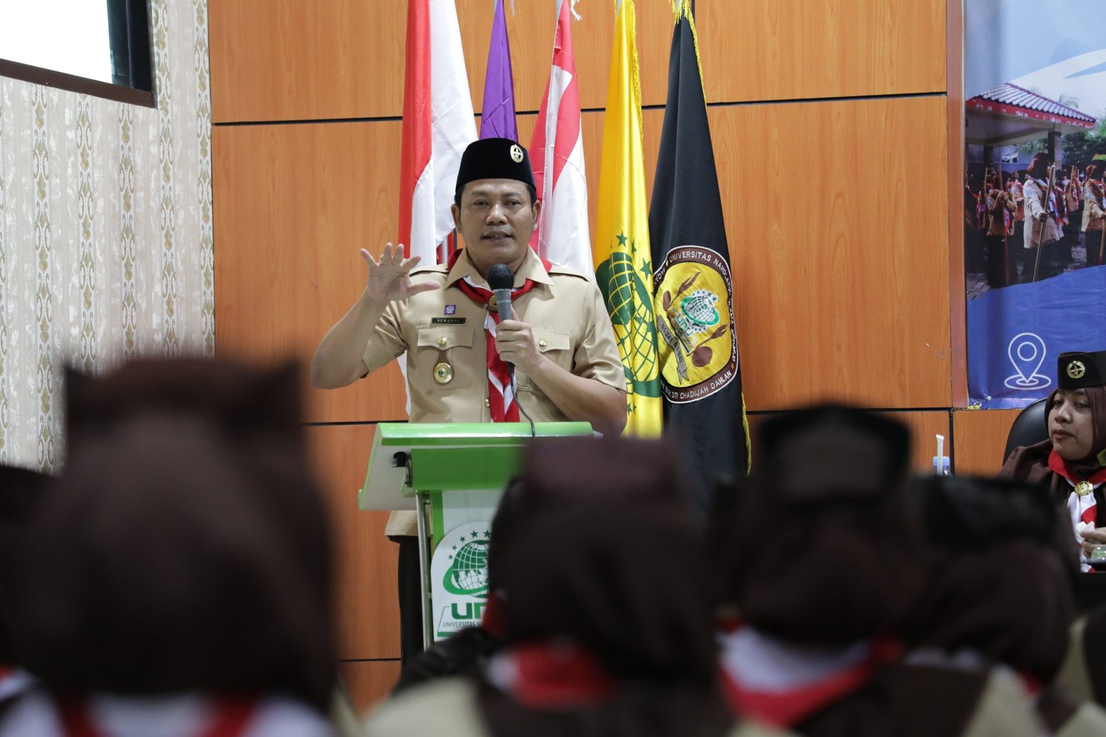 Foto: Plt. Bupati Sidoarjo sekaligus Ketua Kwartir Cabang (Kwarcab) Sidoarjo, Subandi mengapresiasi kegiatan Kursus Pembina Mahir Tingkat Dasar (KMD) yang di gelar di Kampus II Nahdlatul Ulama (NU) Kabupaten Sidoarjo pada Sabtu (11/5/2024). (Sumber: BB/Redho).