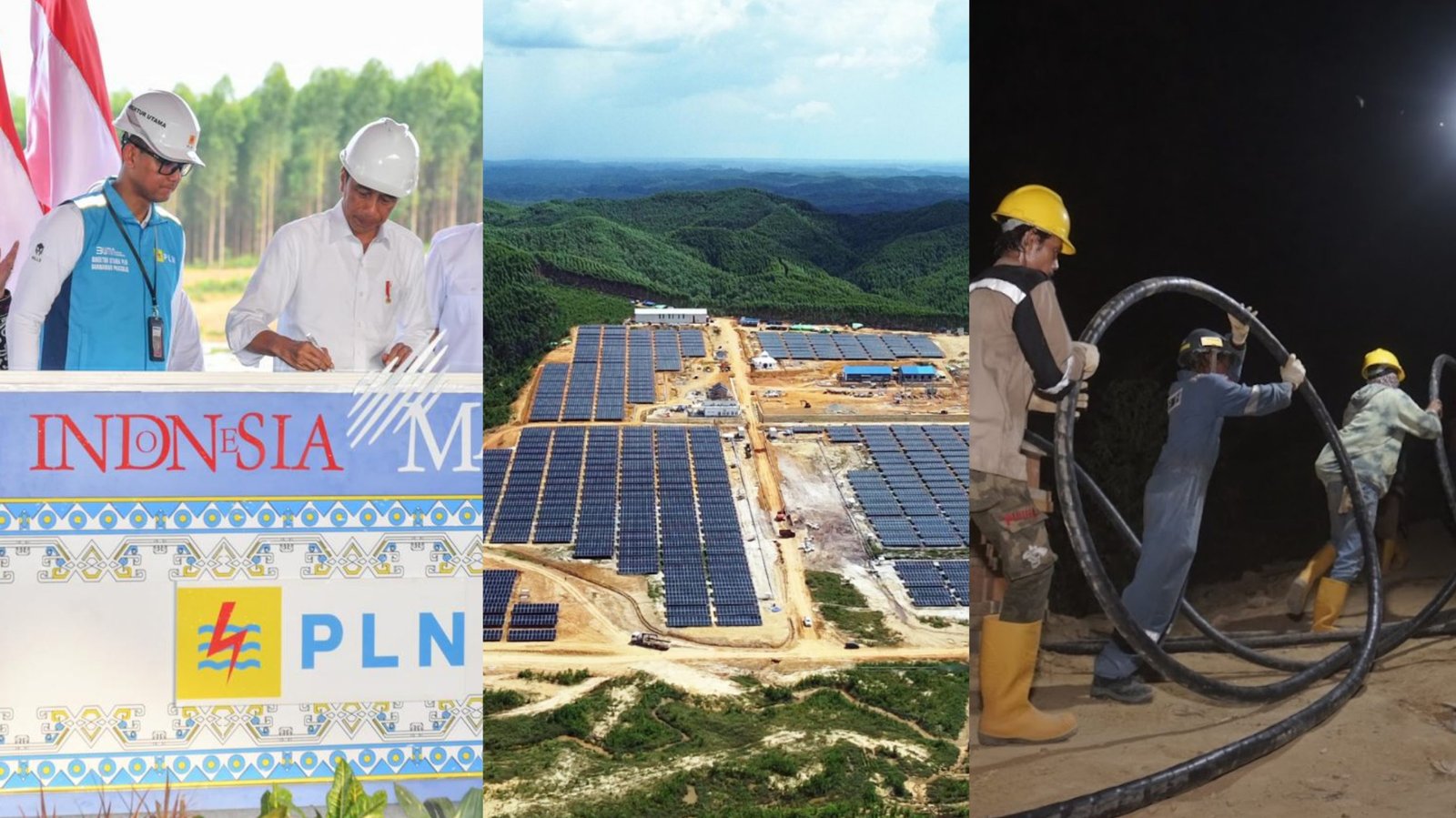 Kolase foto: PLTS IKN 50 MW berdiri di lahan seluas 80 hektar dan mampu menyerap tenaga kerja lokal hingga 337 pekerja. Total panel surya yang digunakan dalam PLTS ini mencapai 21.600 panel surya. (Sumber: BB/hmspln)