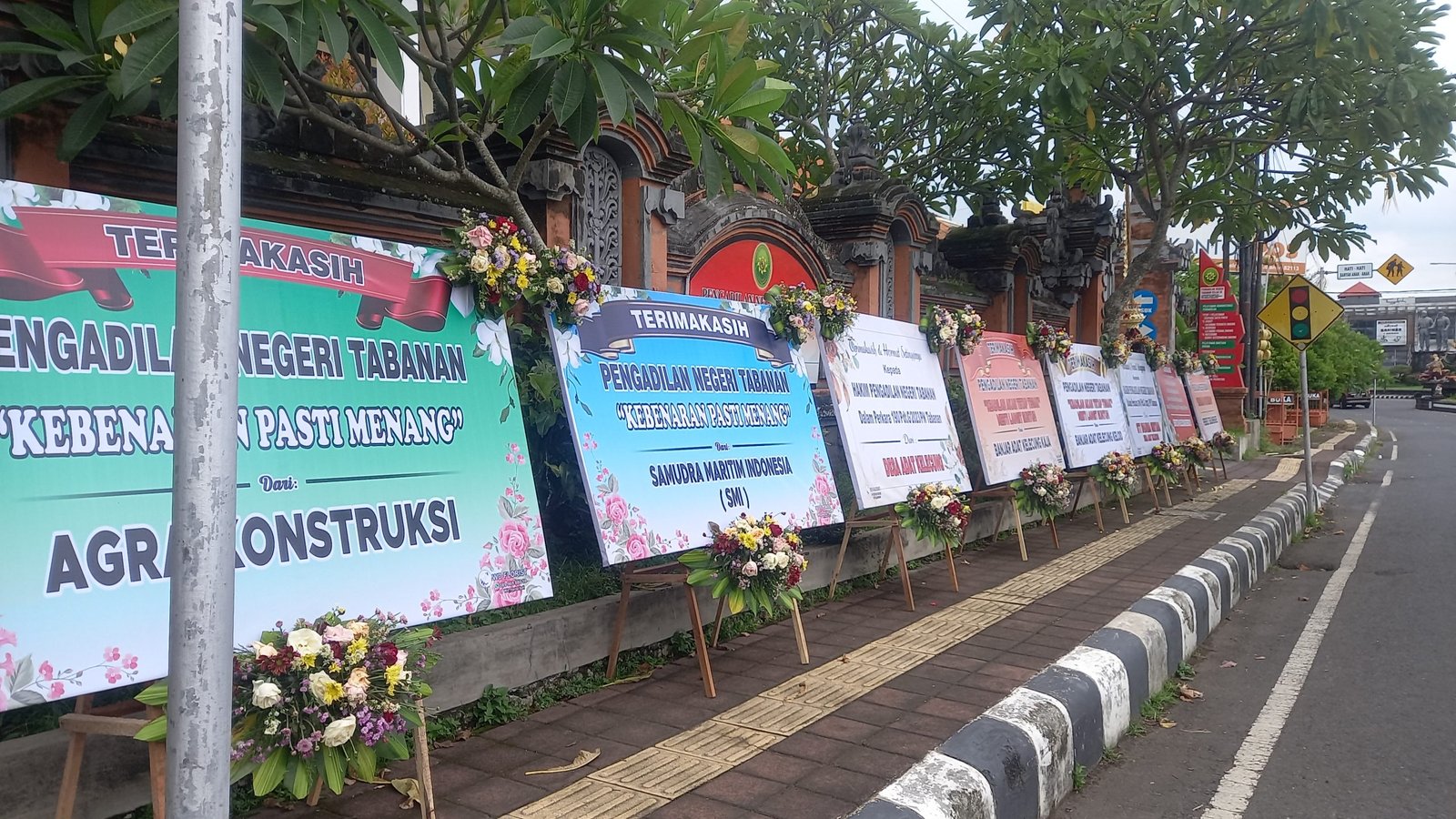 Foto: Suasana berderetnya karangan bunga ucapan selamat atas putusan majelis hakim kasus sengketa tanah di Desa Adat Kelecung di depan PN Tabanan, Rabu (28/2/2024). (BB/212)