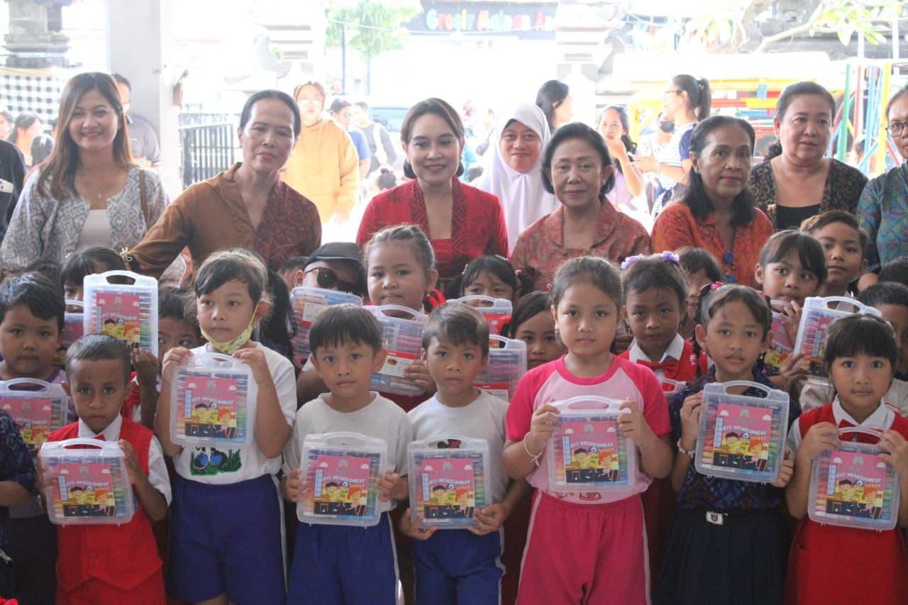 Foto: Ketua GOW Kota Denpasar, Ny. Ayu Kristi Arya Wibawa bersama Ketua DWP Kota Denpasar, Ny. Ida Ayu Widnyani Wiradana bersama Pokja Bunda PAUD Kota Denpasar, kembali menyapa para siswa PAUD/TK di dua kecamatan, yakni Kecamatan Denpasar Timur dan Kecamatan Denpasar Selatan, yang dipusatkan di Bale Banjar Kaja, Tempekan Kubu Delod, Jalan Sidakarya pada Sabtu (4/5) pagi. (Sumber:BB/Esa).