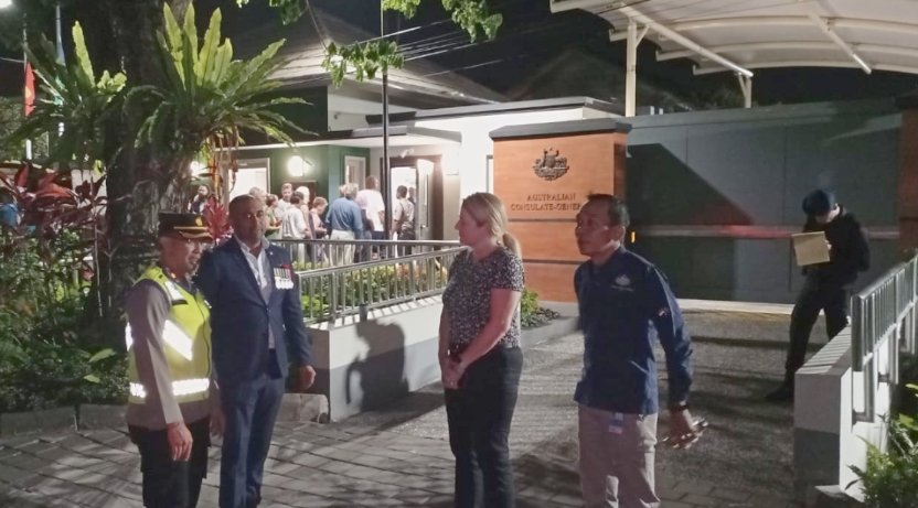 Pengamanan upacara peringatan ANZAC Day (Hari Pahlawan Australia) di Kantor Konsulat Jendral Australia Jl. Tantular No. 32, Renon, Denpasar Timur, Selasa (25/4/2023) pukul 04.30 Wita. (Foto: Hms Polresta Dps/Skd)
